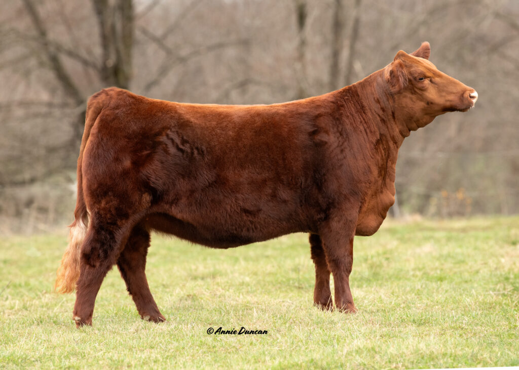 What’s not to love about this deep cherry red heifer? She is structurally correct, deep bodied with a ton of capacity, big topped, square hipped, and to top it off, beautiful fronted. Heart is from the first flush of our newest donor – Red Angel – and we couldn’t be happier with the results! This female is backed by many generations of donors, including the $37,000 Victoria’s Secret and Too Cool. Juniors, if you are looking for a halter broke heifer for Eastern Regionals in Harrisonburg, Va this year, be sure to check out this show heifer/donor quality female.