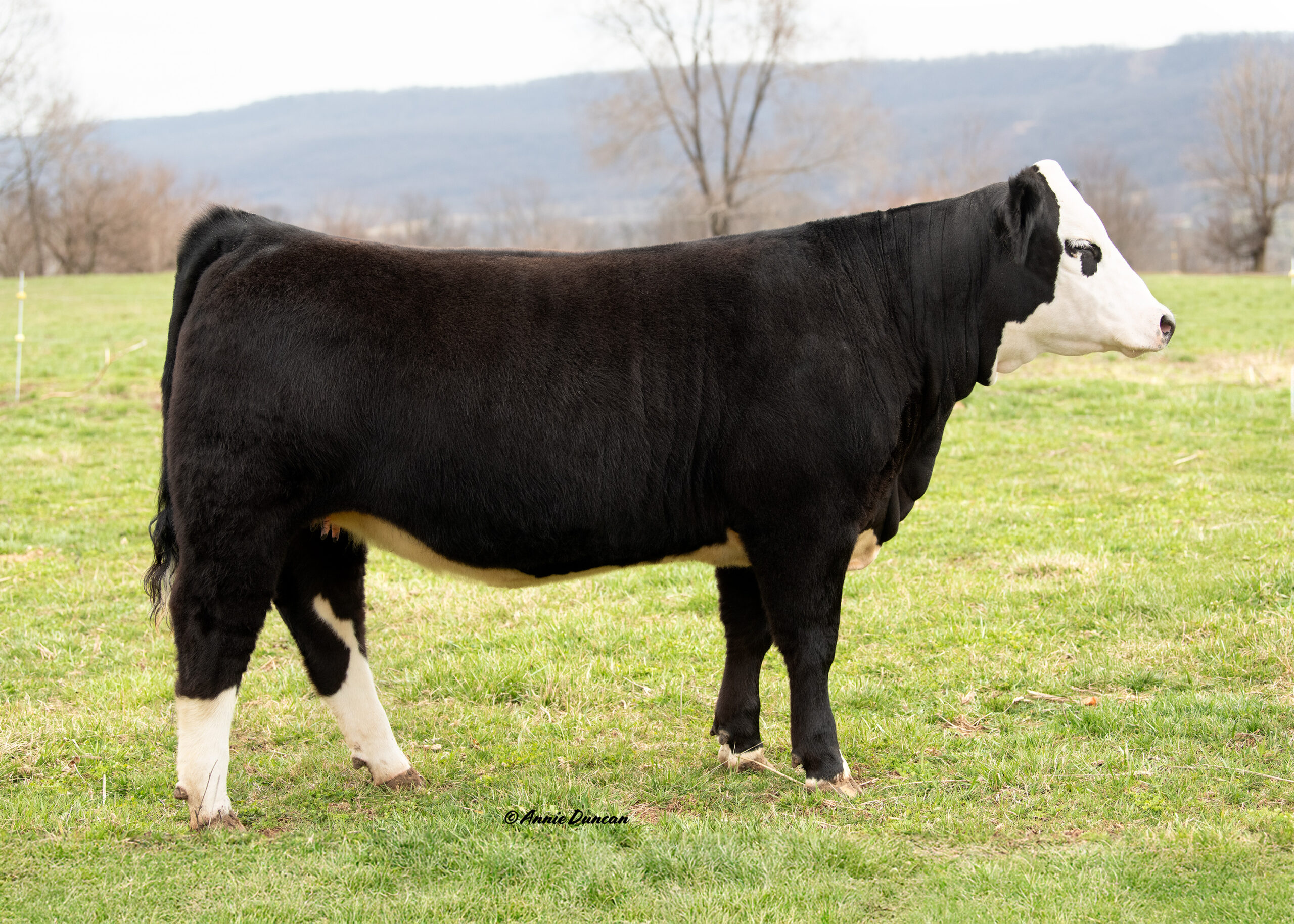 Miss Diamond is a thick, deep ribbed, very clean fronted female out of our Brightie cow family. This heifer has everything we love in a female– substantial bone, power, femininity, an incredible pedigree, and to top it off, halter broke! Don’t overlook her because she is solid black, there are plenty of bulls out there to put white on her calves. Take Miss Diamond home and let her shine in your pasture!